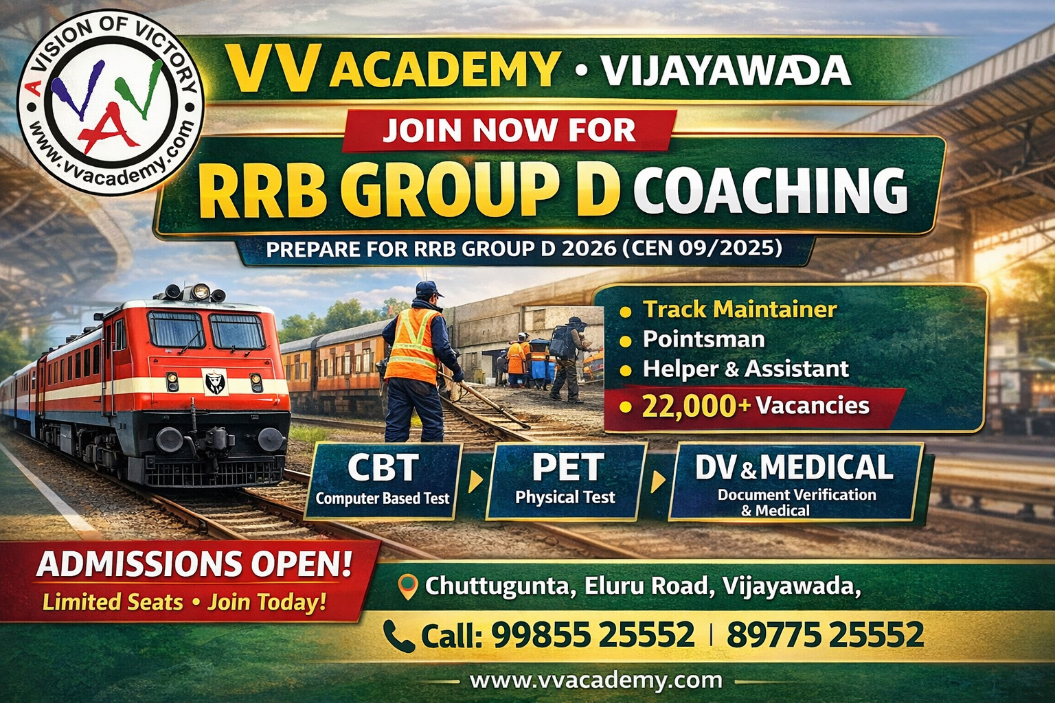 Prepare for RRB Group D Railway Jobs with expert coaching at VV Academy, Vijayawada. Get complete syllabus, exam pattern, PET details and eligibility in one place.